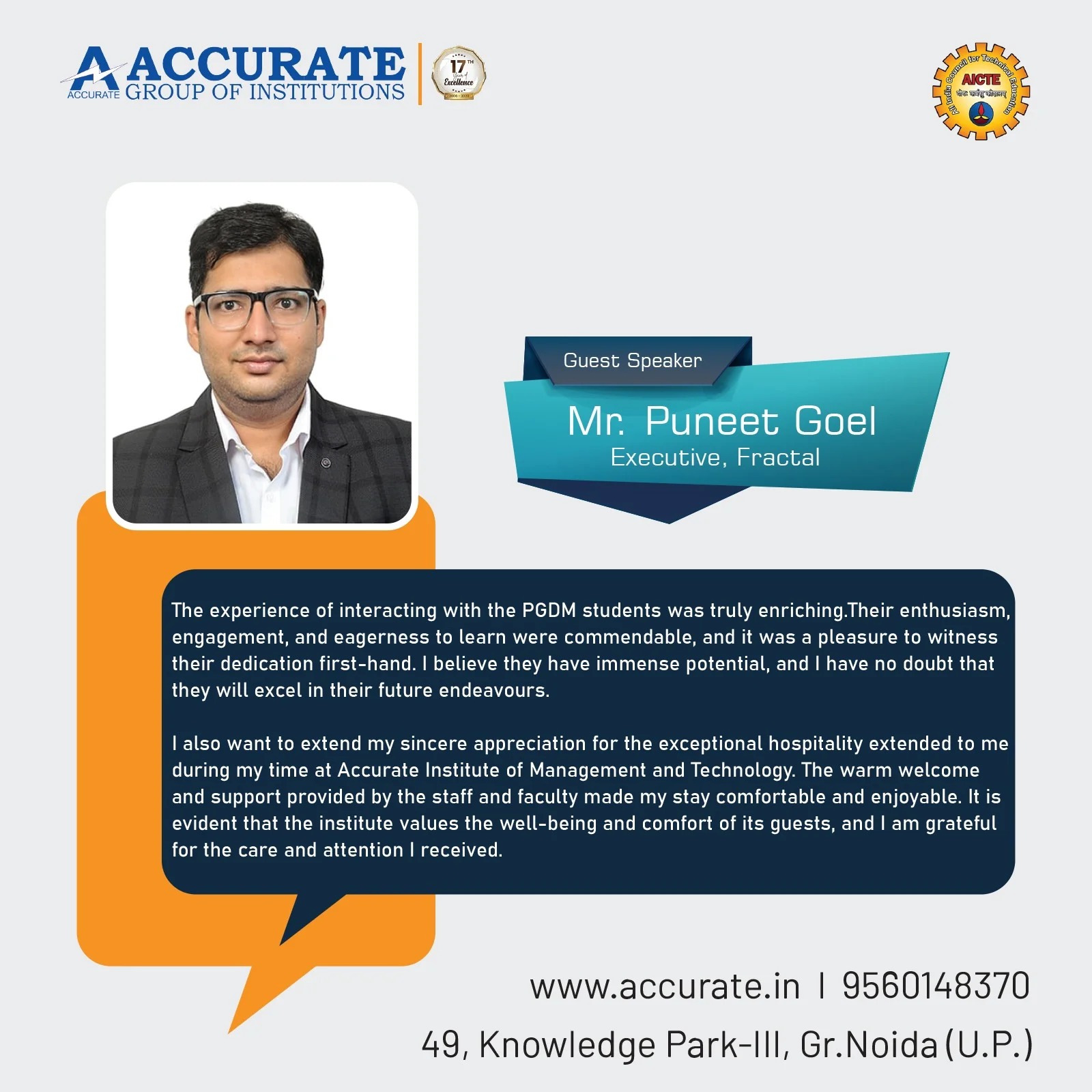Join us as Mr. Puneet Goel, Executive at Fractal, shares his profound experience engaging with the PGDM students at Accurate Institute of Management and Technology. Discover firsthand the enthusiasm, dedication, and potential of these students, as well as the exceptional hospitality and support extended by the institute's staff and faculty. Mr. Goel's insights shed light on the transformative impact of quality education and genuine hospitality in shaping future leaders.