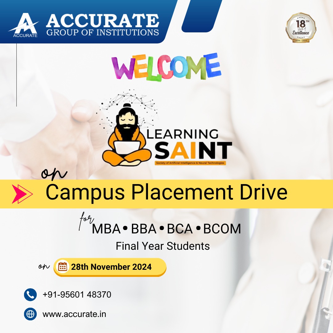 Exciting Opportunities Await! Accurate Group of Institutions welcomes Learning Saint for a Campus Placement Drive for MBA, BBA, BCA, and BCOM final-year students. Don't miss out—mark the date: 28th November 2024.