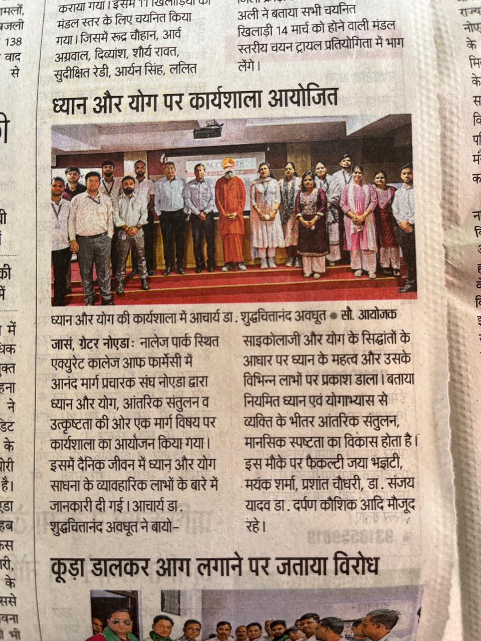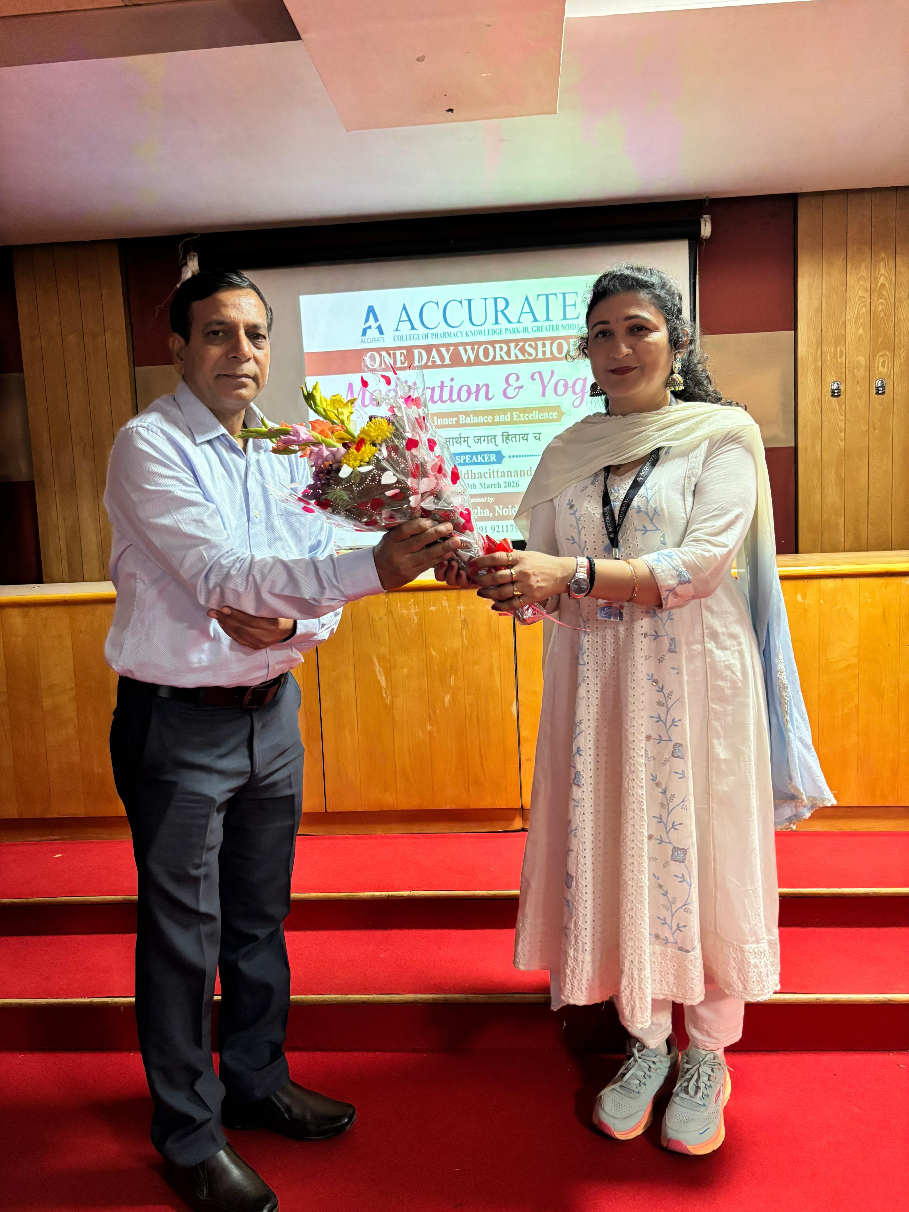 A workshop on Meditation and Yoga Practices was successfully organized on 13th March 2026 in the Seminar Hall of Accurate College of Pharmacy in collaboration with Aanad MargSociety. The event aimed to create awareness among students and faculty members about the importance of yoga, meditation, and a balanced lifestyle for physical, mental, and emotional well-being.