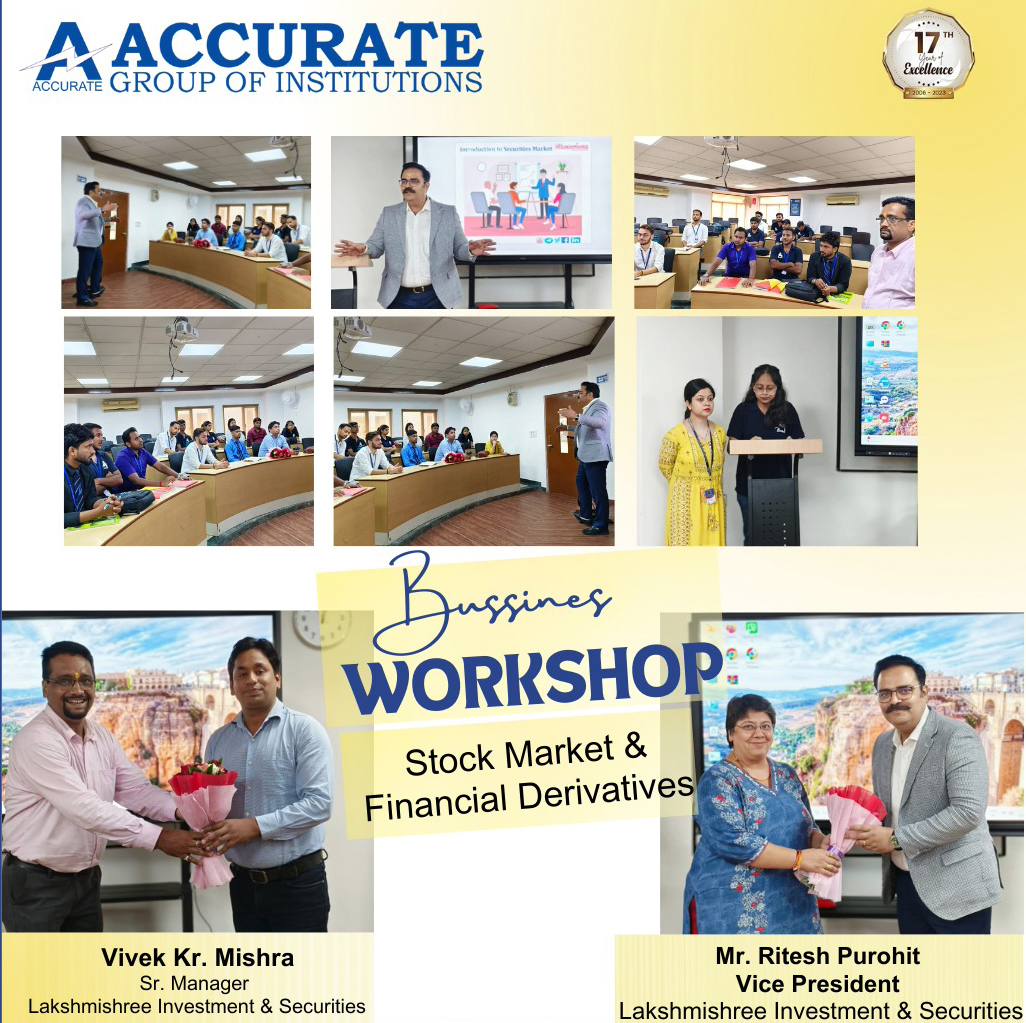 The in-depth workshop on stock market intricacies and financial derivatives led by industry experts Ritesh Purohit and Vivek Kr. Mishra at Accurate Group of Institutions was a huge success! Attendees gained valuable knowledge, learning from the VP of Lakshmishree Investment & Securities.