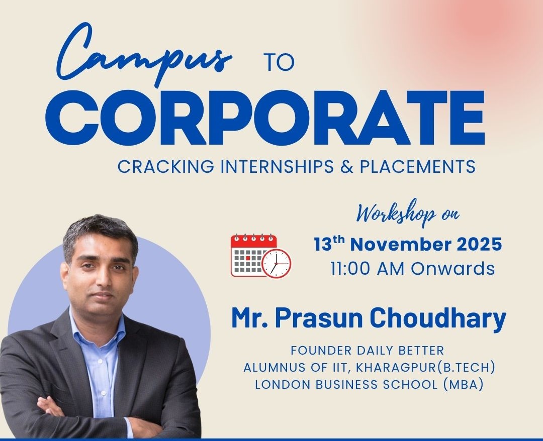 The workshop will guide students on cracking internships and placements, understanding corporate expectations, and building essential professional skills.